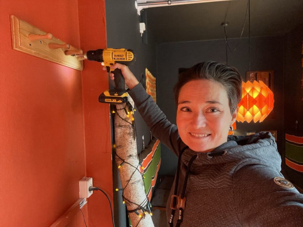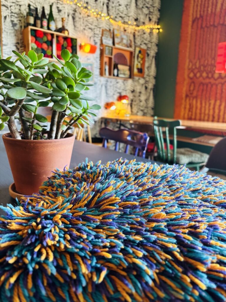 Retro-lamper og garnkunst pryder Det gamle hundebad som er indrettet i ægte 70’er stil, som din mormors stue!