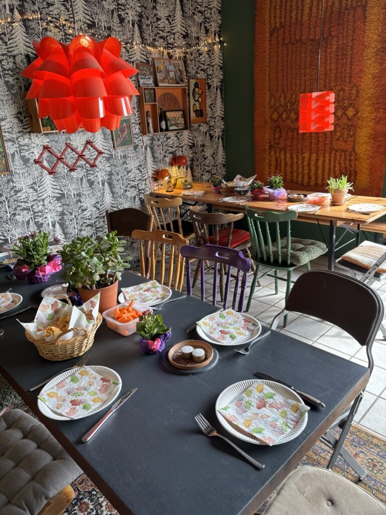 Vi har 45-50 siddepladser fordelt på to hyggelige 70’er-indrettede rum, lidt ligesom Mormors stue. Men du må gerne invitere flere, blot de ikke behøver en stol. I det største rum kan 35 personer med lidt held sidde samlet ved at vi indsætter et ekstra langbord.